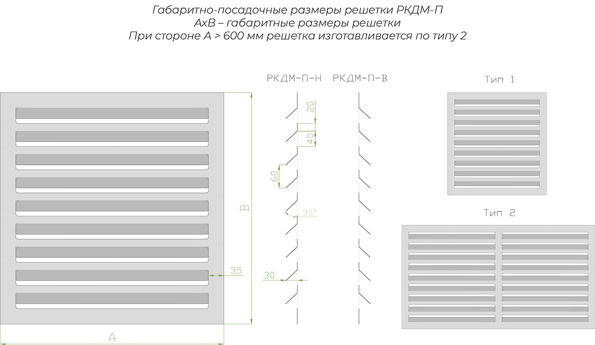 Представляет собой оцинкованный лист с отогнутыми ламелями на 30 мм, глубина рамки решетки равна толщине листа - 0,9 мм. Определяющими размерами (АхВ) при заказе являются габаритные размеры решетки.