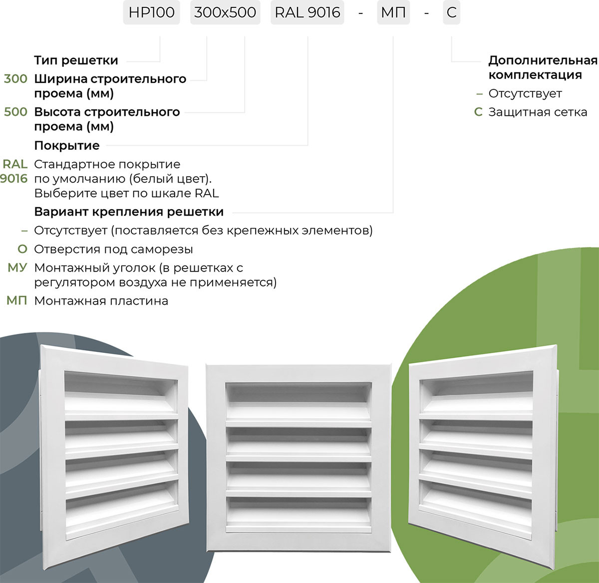 Решетки данного типа предназначены для монтажа чаще всего в большие проемы и в воздуховоды, где требуются решетки с увеличенным коэффициентом живого сечения. Максимальная скорость воздуха в свободном сечении решетки НР100 допускается до 15 м/с, конструкция и используемые при производстве материалы обеспечивают надёжность конструкции при больших скоростях воздуха. Решетки НР100 рекомендуется использовать при рабочем сечении до 7,2 м2. Для предотвращения провисания ламмелей при ширине строительного проёма более 1200мм решетка поставляется с вертикальной перемычкой с задней стороны решетки, которая крепиться к каждой ламели.