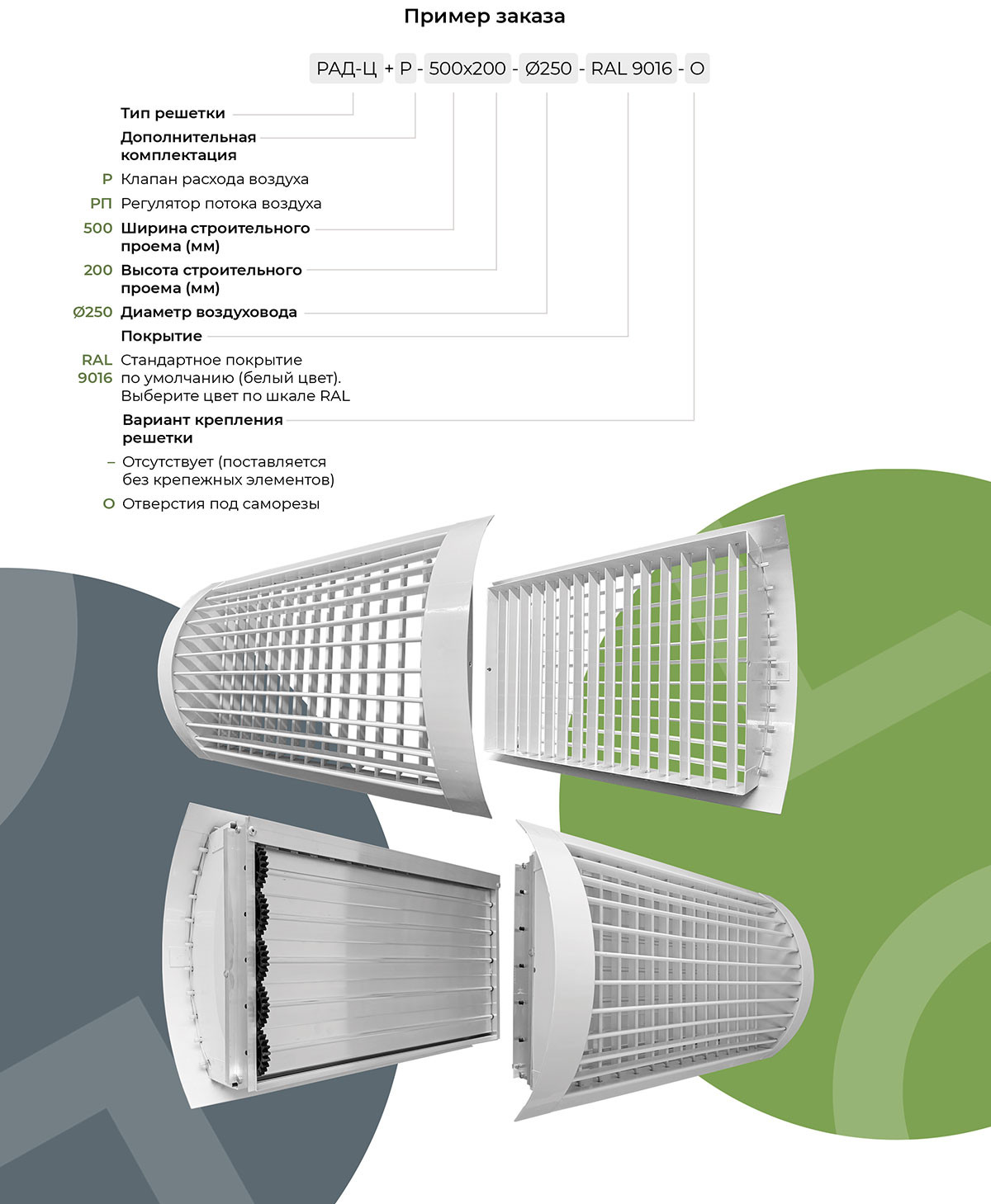 Двухрядная цилиндрическая решетка РАД-Ц+P оснащена клапаном расхода воздуха (КРВ). Решетка используется в приточно-вытяжной вентиляции и системах кондиционирования воздуха и предназначена для установки в круглый воздуховод. Она регулирует объем и направление воздушного потока вверх и вниз.