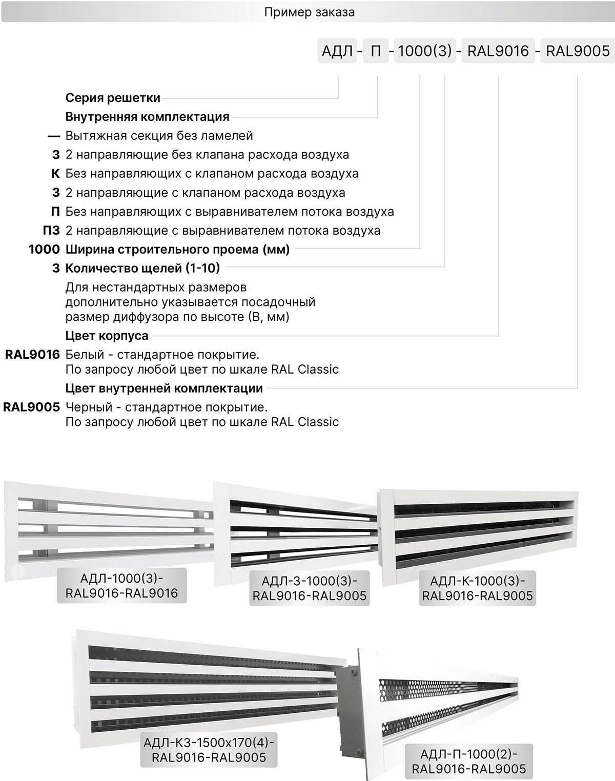 Щелевые решетки АДЛ-П изготавливаются из экструдированного алюминиевого профиля АД31 по ГОСТ 22233-2001. По умолчанию корпус диффузоров окрашивается в стандартный белый цвет RAL 9016, а внутренняя перфорированная кассета в чёрный цвет RAL 9005. По индивидуальному заказу возможна окраска в любой цвет по шкале RAL как корпуса, так и внутренней части.
